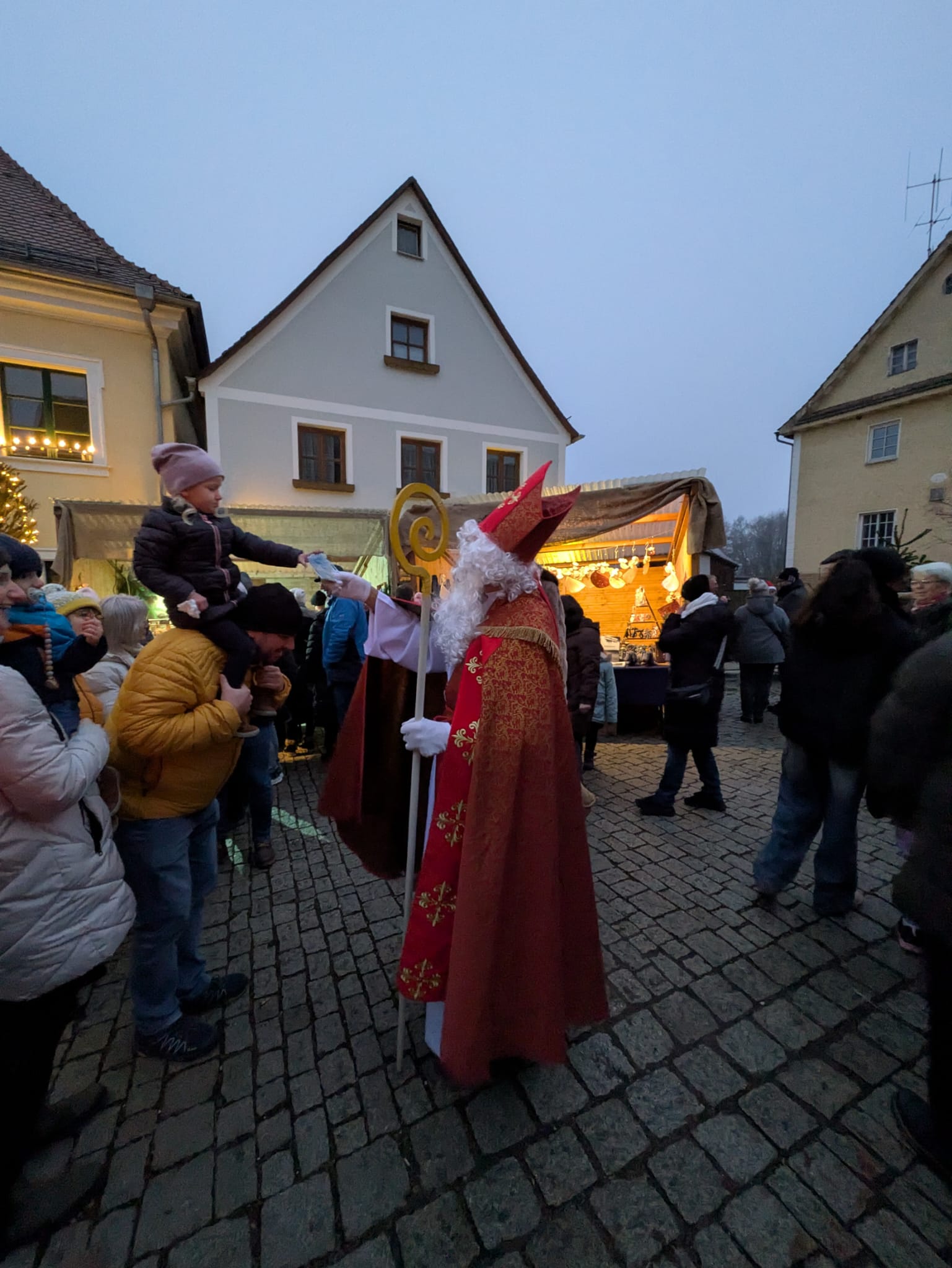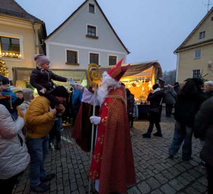 Um ca. 16:00 Uhr beschenkt der Nikolaus mit Knecht Ruprecht die kleinen Besucher des Marktes. Am Hexenhaus gibt’s ab 14:00 Uhr Lebkuchen von der Hexe.